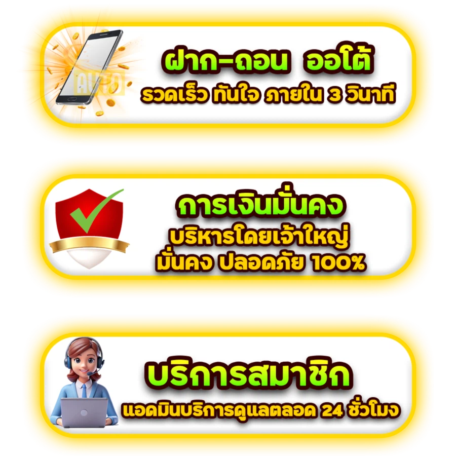 ระบบฝาก-ถอนรวดเร็วภายใน 30 วินาที รองรับธนาคารชั้นนำและ True Wallet มีทีมงานคอยให้บริการตลอดเวลาผ่านช่องทางไลน์ เว็บไซต์ออกแบบให้ใช้งานง่าย รองรับทั้งคอมพิวเตอร์และมือถือ